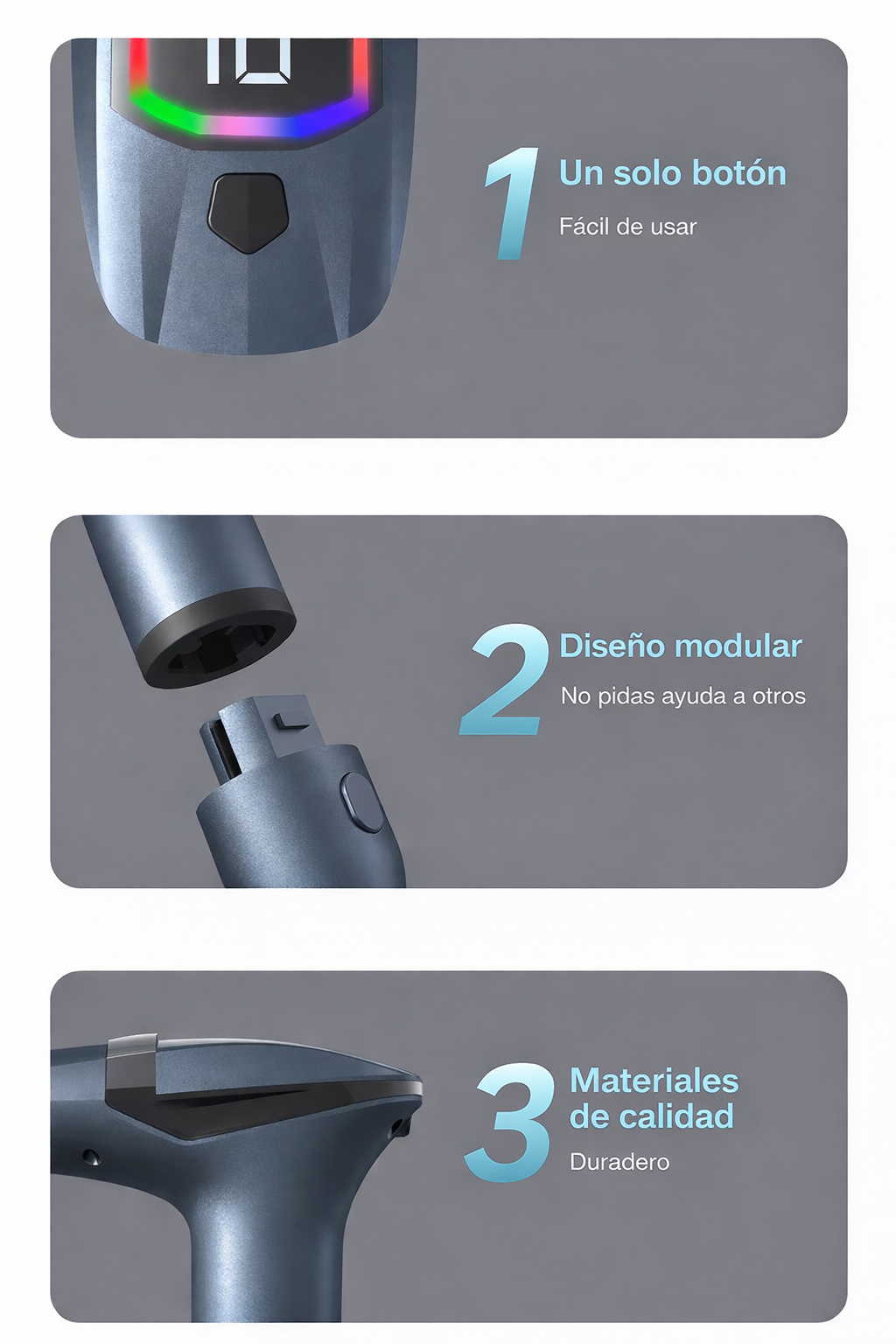 Su diseño compacto, potente y ergonómico garantiza un uso sencillo y cómodo, mientras que el cable de carga tipo C incluido asegura que siempre esté lista cuando la necesites.