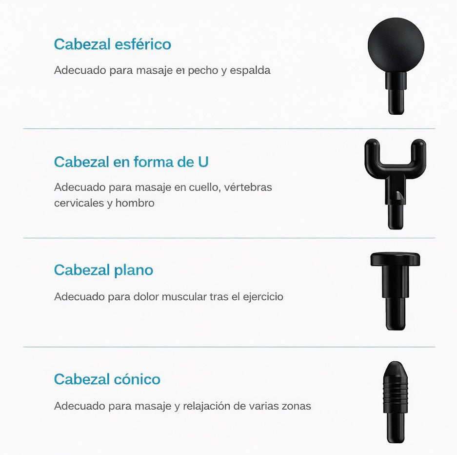 Incluye 4 cabezales intercambiables, ideales para adaptarse a distintas zonas del cuerpo como espalda, piernas, brazos o cuello, además de un acople extensor que facilita el acceso a áreas difíciles y una cinta vibratoria para un masaje más amplio y envolvente.